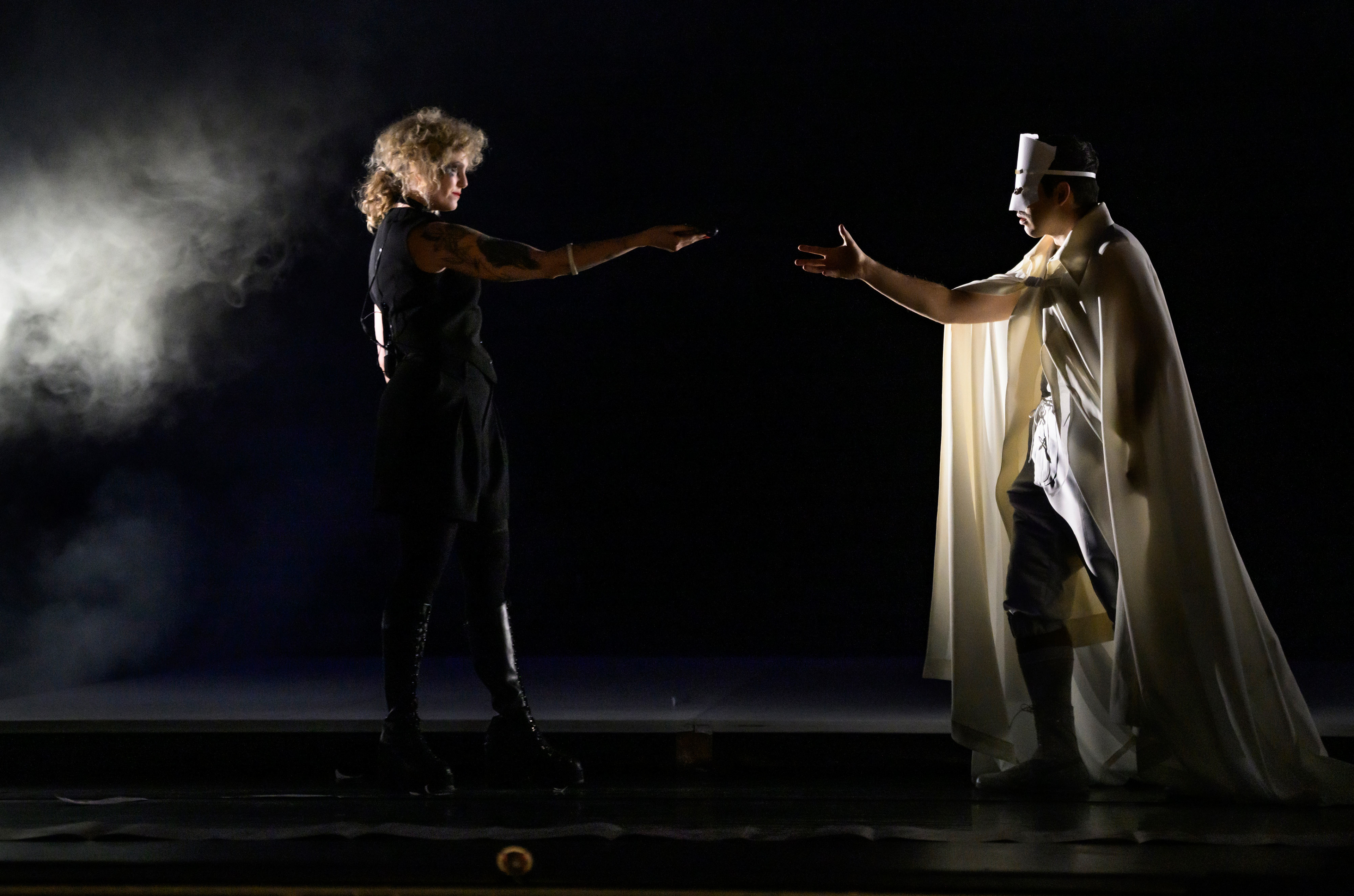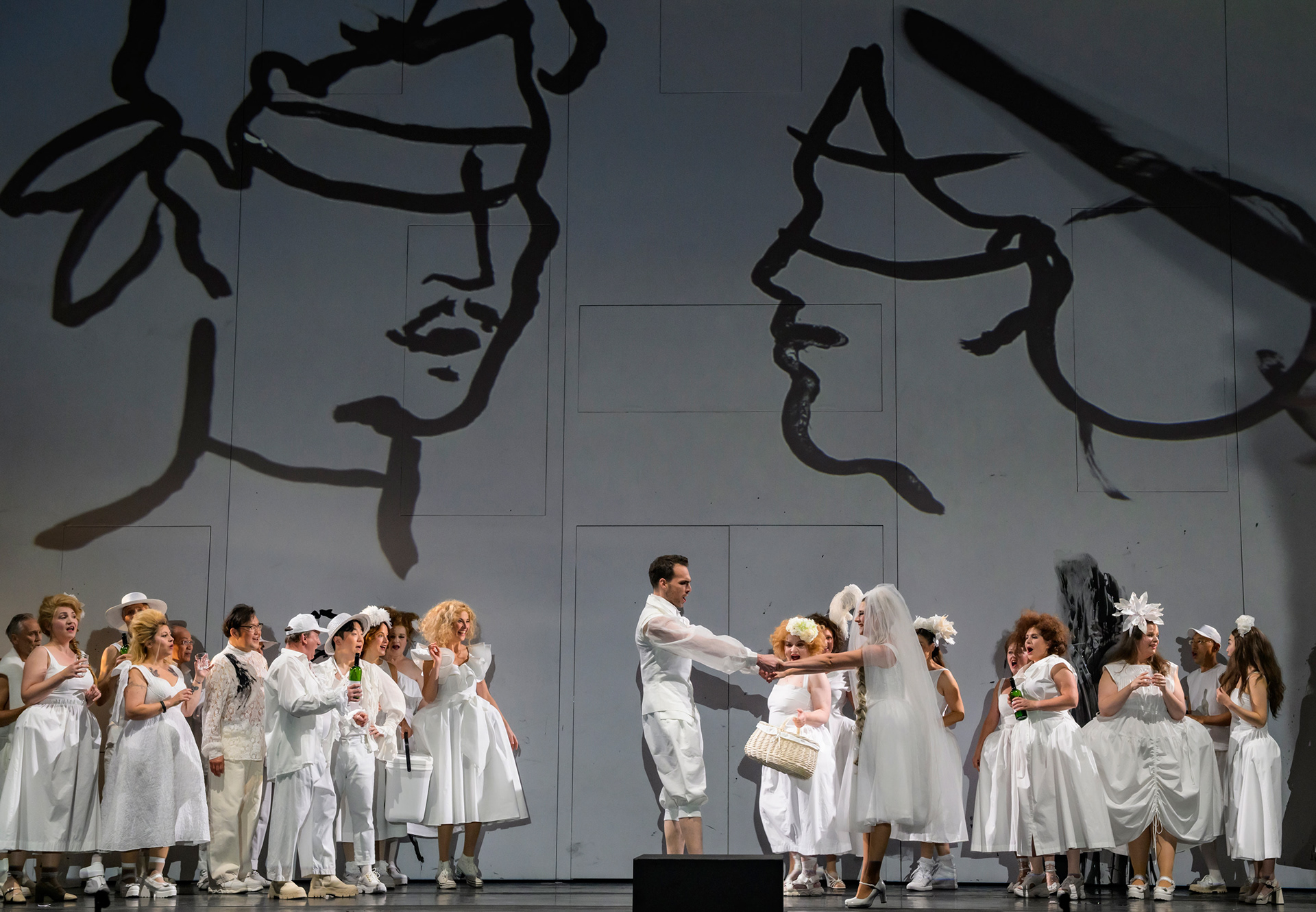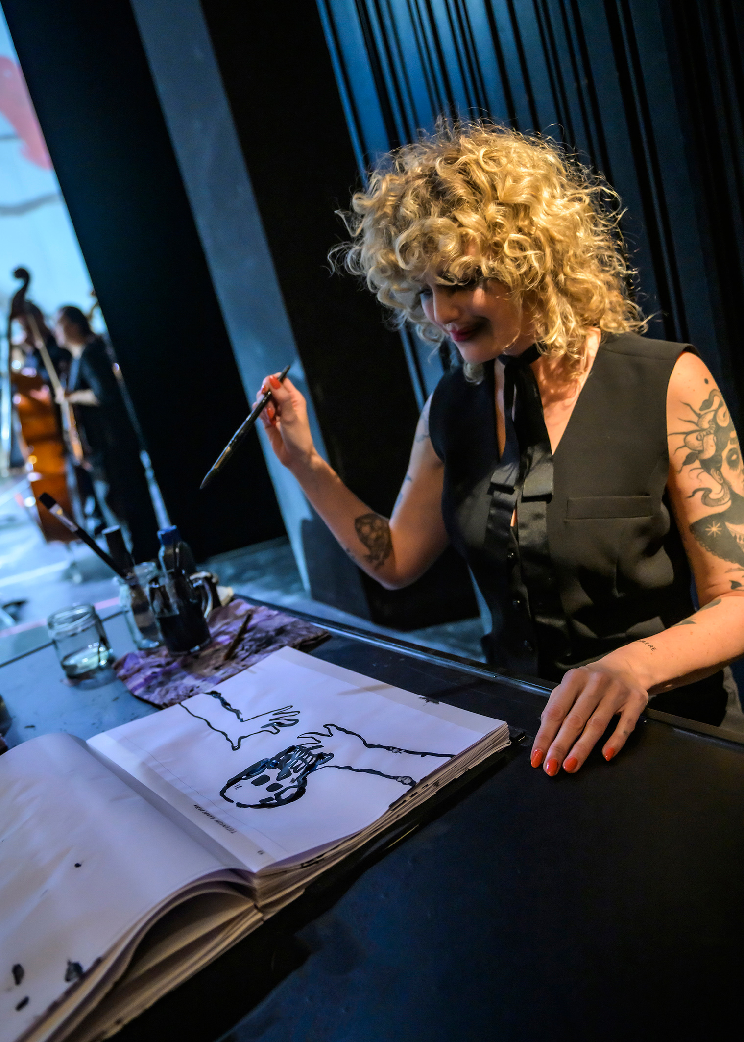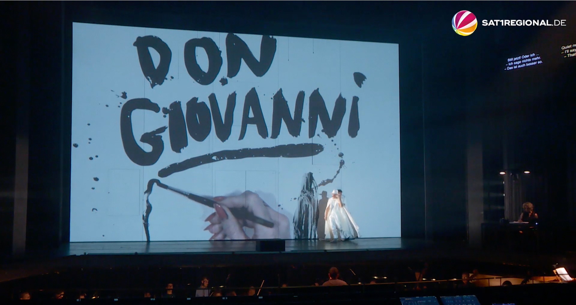I paint live during the performances of the opera "Don Giovanni" at Staatsoper Hannover starting October 2025. My illustrations are created live, projected via camera, and painted directly onto the stage set in real time. I interact with the singers and with the musicians. Photos by Bettina Stöß.